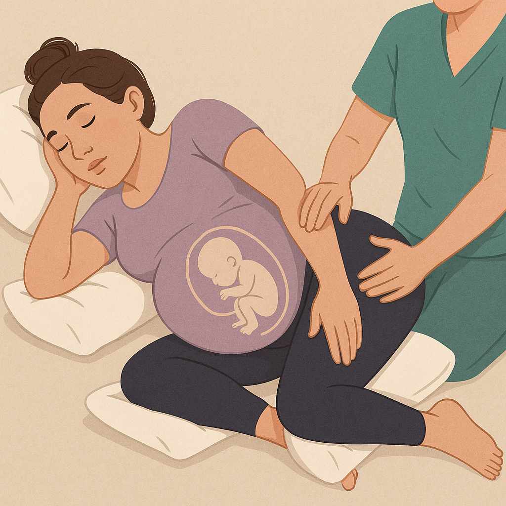 Sideleje er en udbredt og praktisk position, fordi den aflaster maven og gør det lettere at støtte bækken og ryg. Puder kan placeres mellem knæene, under den øverste arm og eventuelt under maven, så lænden ikke “hænger”. Nogle bruger også en halvliggende position, hvis du fx har halsbrand eller bliver utilpas ved at ligge fladt.