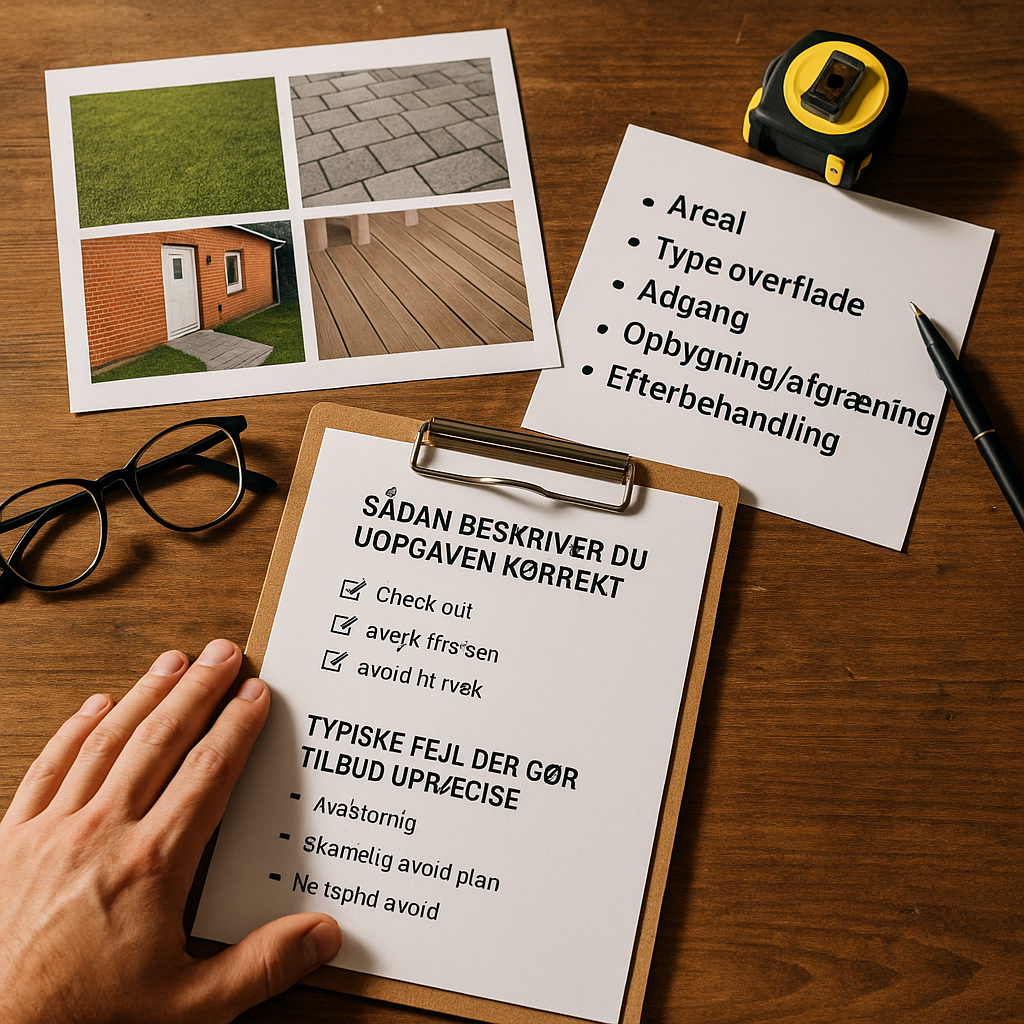 I denne artikel får du en praktisk gennemgang af de vigtigste faktorer, der styrer prisen: areal, type overflade, adgang, opbygning/afdækning og efterbehandling. Du får også en kort tjekliste til at beskrive opgaven korrekt og tre typiske fejl, der gør tilbud upræcise, så du kan sammenligne æbler med æbler.